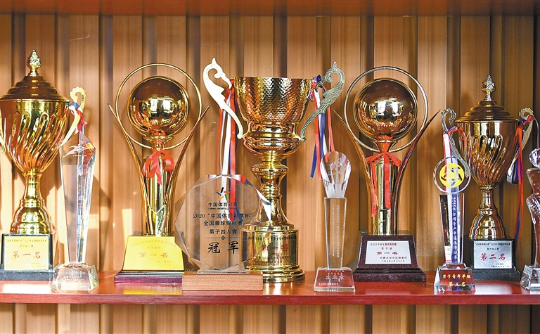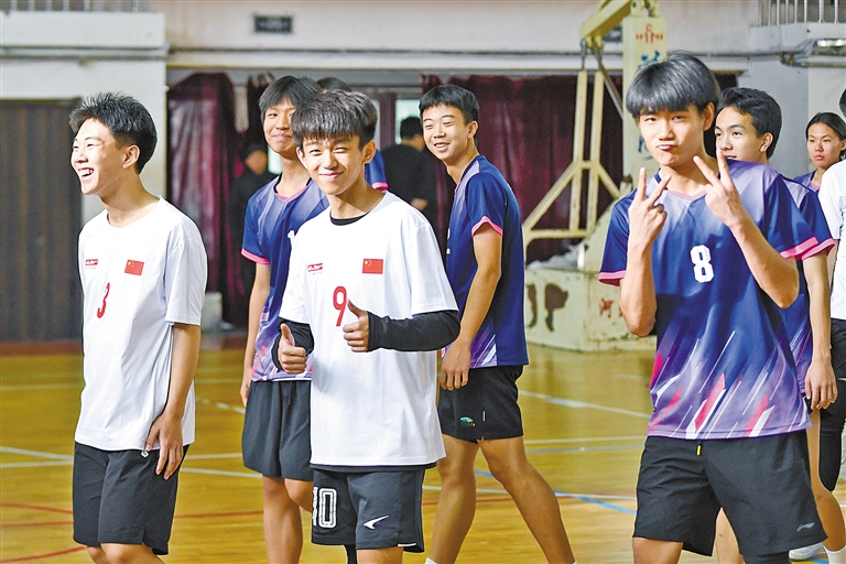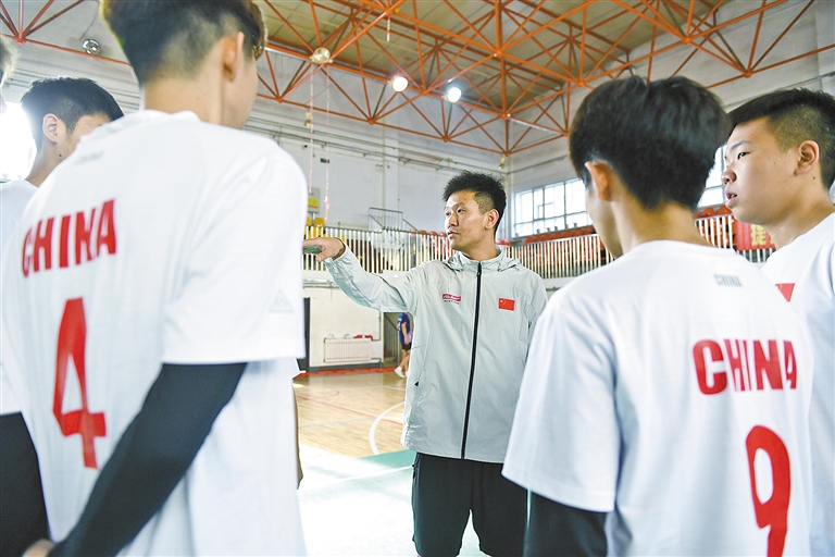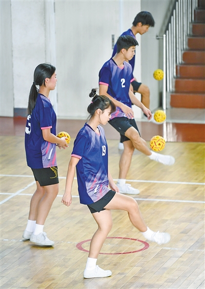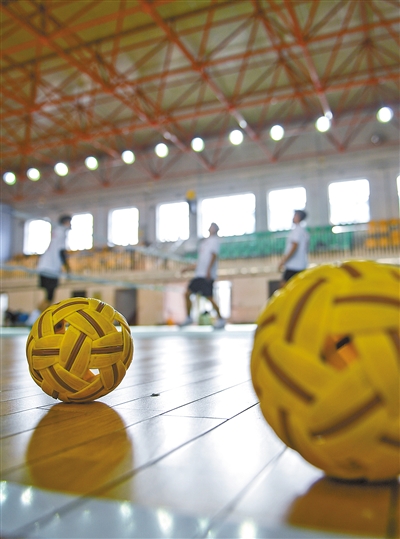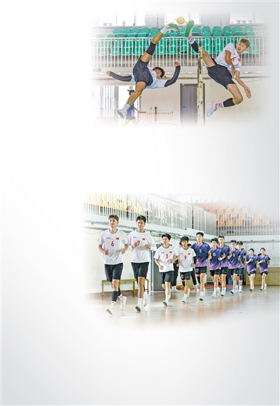 “藤球又被称为‘脚踢的排球’,对身体综合素质要求很高。比赛中队员只能用脚、腿、肩和头触球,所以赛场上经常会出现倒挂金钩式扣球、半空齐肩踢球、腾空转体180°等高难度动作。达不到一定的水平球是踢不起来的。”教练张茹昊告诉记者,每位运动员都要从最基本的动作开始练习,一个简单的动作也需要重复上万次,才有可能踢到球,才能进行后面的技巧训练。