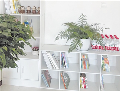 客厅的一角,放有书本。墙上贴着治愈患儿的照片和勉励的话语,十分温馨。