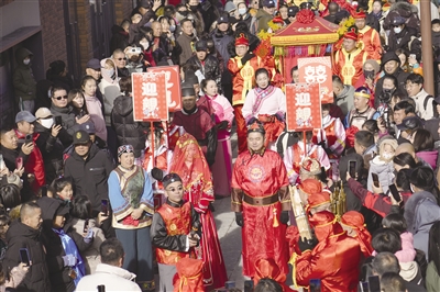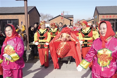 跟着福猪向前跑,嘿呦嘿呦;好运连连福星照,嘿呦嘿呦;金银财宝家中抱,嘿呦嘿呦;欢欢喜喜福星照,嘿哟嘿呦;福猪福猪向前突,嘿呦嘿呦……“金猪纳福”巡游是活动现场民俗表演的重头戏,穿着艳丽服装的演员们,抬着一头肥壮的大白猪高喊着口号一路前行,游客簇拥在表演队伍的周围,现场气氛达到了高潮。“今年冬天的黄河观凌周活动真是有太多惊喜,特别是‘金猪纳福’这样的民俗表演,红火热闹又能近距离体验沿黄的民俗文化,让人意犹未尽。”早早从市区赶到活动现场的赵先生说道。
