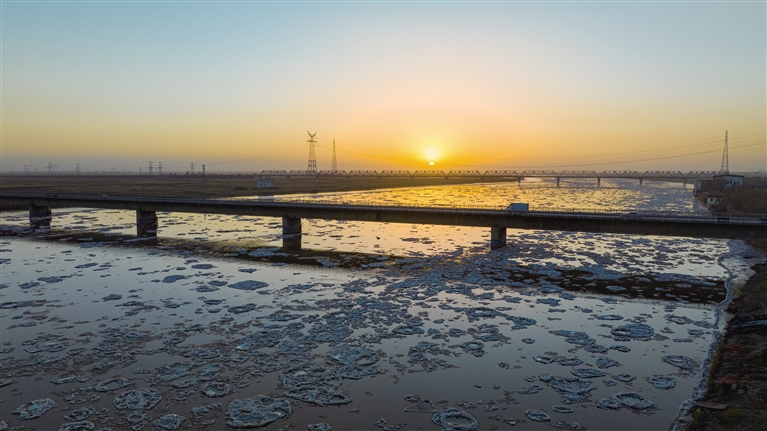 行走黄河之畔,感受大河浩荡。随着低温寒潮天气到来,奔腾不息的大河放慢了“脚步”,大小不一的冰凌,晶莹剔透的冰碴,铺满河面、顺流而下,带来冬日最值得期待的壮美景观;极目远眺,冰凌覆盖,层层叠叠,甚是耀眼。走进小白河湿地公园,金色的夕阳斜照在波光粼粼的水面上,冬日的旷远与灵动在此刻倾泻而出。被小白河湿地公园怀抱着的包头黄河国家文化公园正在这美景中与不远处的城市灯火深情对望,向人们诉说着古老的黄河故事。
