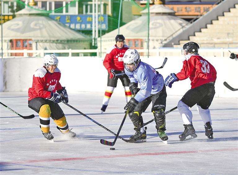 12月27日,呼和浩特首府人冰球队队员(蓝色)在比赛中带球突破。当日,第十一届大众冰雪季呼和浩特市冰雪运动系列活动冰球公开赛在内蒙古赛马场开战。本次比赛为期3天,期间共有来自包头、呼和浩特、乌兰察布、呼伦贝尔的6支代表队参加角逐。本次赛事旨在通过冰球运动促进身心健康、增强团队合作精神,推动冰球运动的普及与发展。本报记者 孟和朝鲁 摄