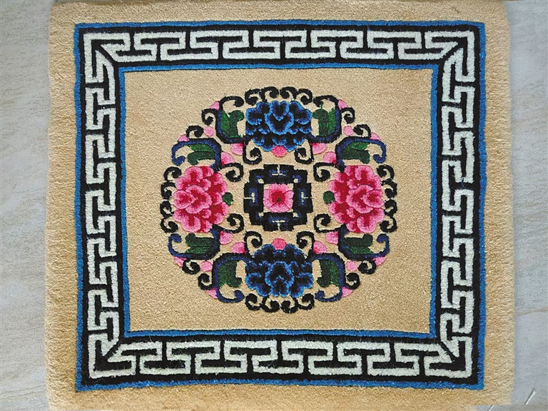 目前,在阿拉善地毯织造领域较活跃的当数自治区级代表性传承人段丽珍,她今年将近70岁,从事阿拉善地毯织造长达50多年,对各道工序了如指掌,尤其擅长片花、仿古地毯的织造技术。