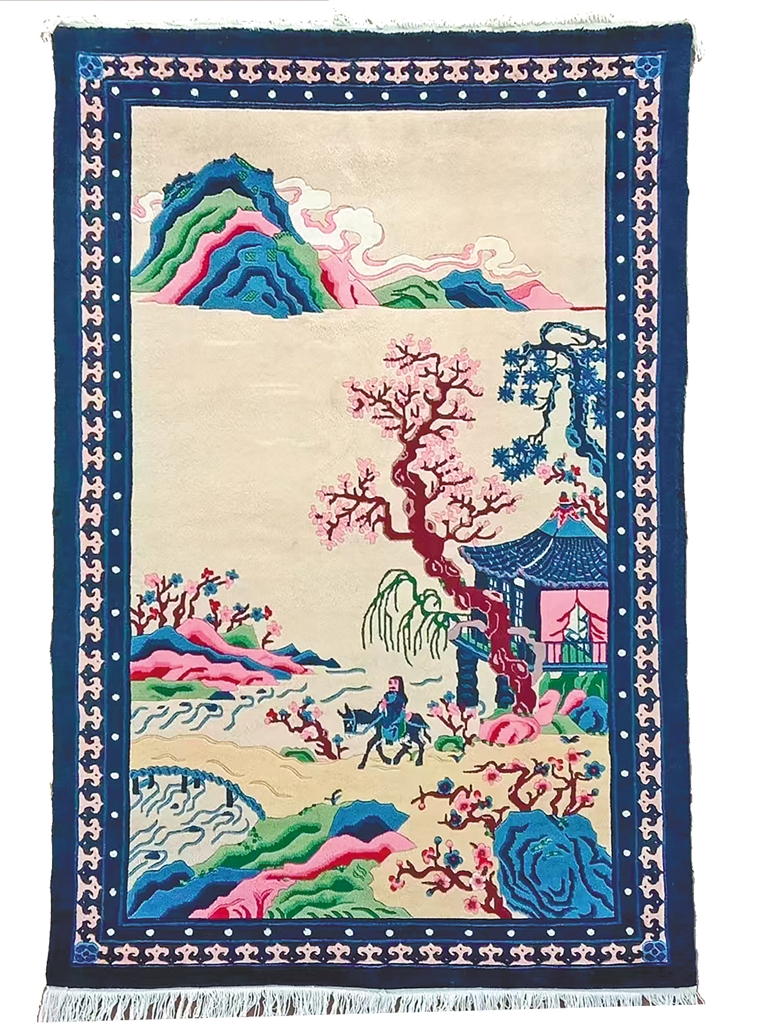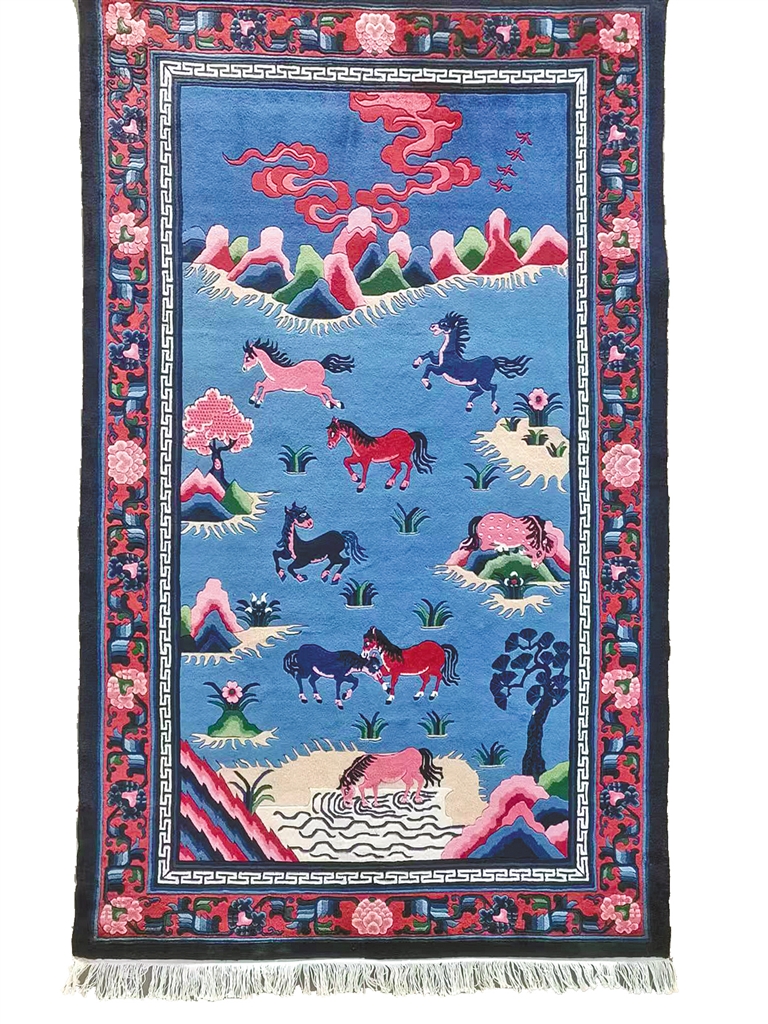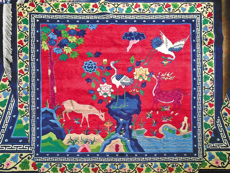 此外,阿拉善地毯织造技艺中代表作《山水牡丹》《海水朝阳》《满地金砖》《鹿鹤同春》《九龙抱柱》等,都是国内地毯中的精品。作品表现了内蒙古西部历史文化的沉淀以及审美情趣和地域生态文化,成为了解内蒙古的一扇窗口。