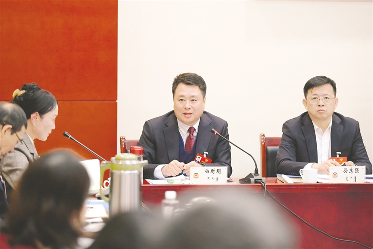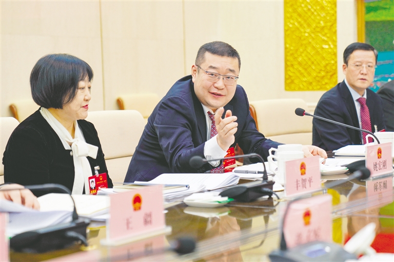 1月16日,锡林郭勒盟代表团姚宏刚(中)代表建议,实施差异化生态保护红线管控措施,助力地方解决草原过牧问题,加快推进牧区现代化进程。 本报记者 王晓博 摄