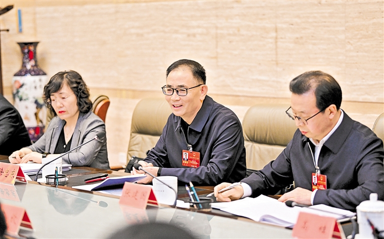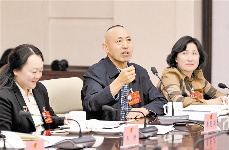 | 1月16日,在讨论两院工作报告时,自治区政协委员骆秀燕(右)建议,切实提升审判工作质效,下大力量解决“执行难”问题,加大对虚假诉讼的惩治力度,为高质量发展提供坚实的司法保障。本报记者 孟和朝鲁 摄 |