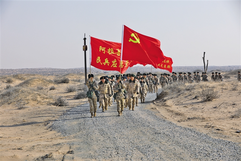 1月23日,官兵们徒步行军。当日,根据年度军事训练计划安排,阿拉善军分区组织师团两级机关和阿拉善左旗民兵应急分队100多人,开展2025年度冬季适应性训练。 本报记者 刘宏章 摄