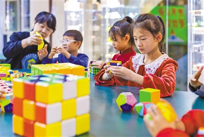 孩子们练习拼魔方。