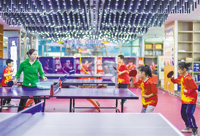 孩子们练习乒乓球技术。