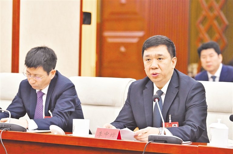 3月9日,全国人大代表李中增(右)在审议“两高”工作报告时建议,司法机关应该对可以应用人工智能的范畴作出明确规定,并加以鼓励和引导。 本报记者 马建兵 摄