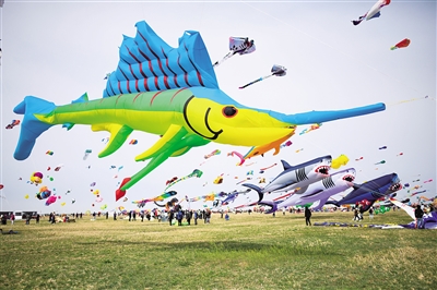 4月18日,参赛选手在潍坊市滨海云门国际风筝放飞场放飞大型软体风筝。当日,作为第42届潍坊国际风筝会的系列活动之一,第21届世界风筝锦标赛在山东省潍坊市滨海云门国际放飞场开赛,来自51个国家和地区的257支队伍、1971只参赛风筝参加角逐。新华社发