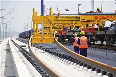 4月18日,中铁十一局工人在西延高铁西安阎良段进行铺轨作业。当日,随着现场作业人员将首对500米长钢轨平稳地铺设在无砟轨道板上,由西成客专陕西公司建设、中铁十一局施工的西延高铁全线铺轨施工正式启动,西延高铁建设进入最后攻坚阶段。西安至延安高速铁路全长299.8公里,是陕北革命老区的首条高铁。新华社记者 张博文 摄