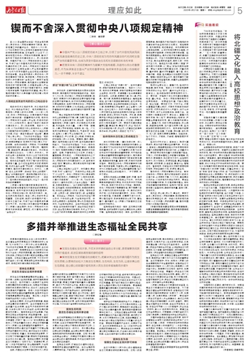 ●保持加强生态文明建设的战略定力,把解决突出生态环境问题作为民生优先领域,以更高的站位大力推进生态惠民、生态利民、生态为民,让绿水青山的生态颜值、金山银山的财富价值和各族人民生活的幸福指数同步提升