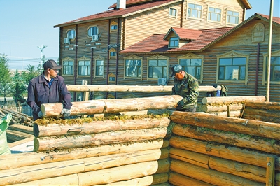 王宝臣说,最早的时候,盖木刻楞一般不起地基,现在都起地基,房内也有了火炕;房檐、门檐、窗檐的彩绘和雕刻是一座木刻楞精工细作的点睛之处,房檐镶嵌成“3D祥云”样式,门上檐用刀子刻出云字边,窗户上、下檐刻着牡丹花或者龙须等图案。