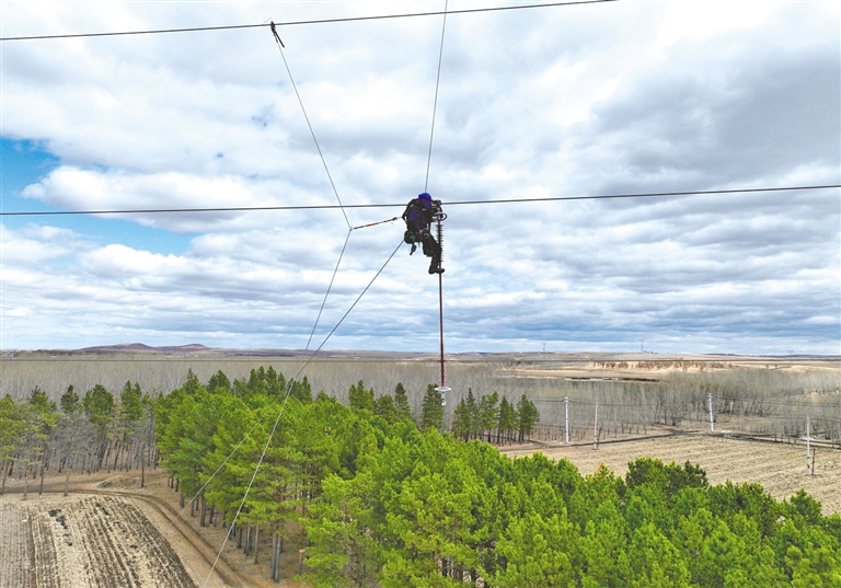 近日,工作人员在高空安装相间间隔棒。大风等天气过程会给电网安全运行带来严重威胁,国网扎兰屯输变电工区不断完善“小飞人”(检修升降器)技术,不仅确保了检修人员在高空复杂环境下的作业安全,还大幅提升了输电线路检修效率。本报记者  李新军  摄