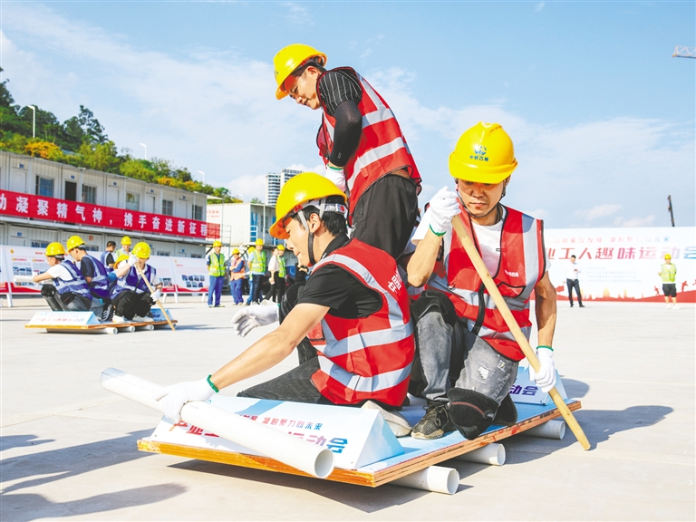 4月27日,工人们在进行旱地龙舟比赛。当日,中铁四局六公司在四川省宜宾市三江新区滨江C组团项目产业工人社区开展“运动赋能促发展 凝心聚力向未来”产业工人趣味运动会。近百名一线工人代表参加拔河、原地踏步60秒、旱地龙舟、安全生产识图等比赛项目,共同迎接“五一”国际劳动节的到来。   新华社记者  王曦  摄