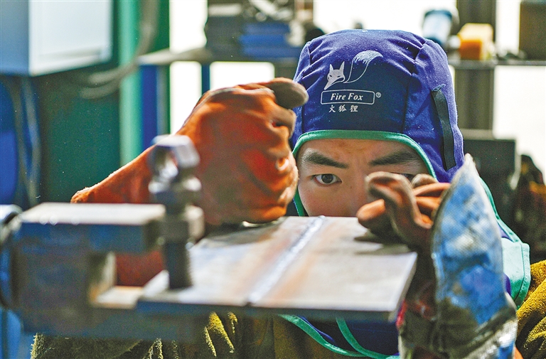 2022年,高磊带领10名焊工赴福建参与大东海精品钢铁工程施工项目时,焊缝检测一次合格率达到了99.5%。