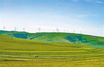 风车在碧空下划出优美的弧线,像上天遗落的竖琴,将游子的心跳捕捉,编成归乡的小调。当大风车近距离出现在转弯处时,它庞大的白色身躯切割着湛蓝天幕,叶片投下的阴影在草原上匀速转动,恍若时光本身。记得八岁那年和小伙伴们趴在麦垛上数星星,听爷爷说“风车是谷仓的守护神”,那时的风车很小很小,立在老村的打谷场边,转动时发出老旧的咯吱咯吱声。然而,此刻钢铁巨人伴着风声发出明亮的尖叫,像谁在辽阔天地间吹响了遗忘多年的骨笛。