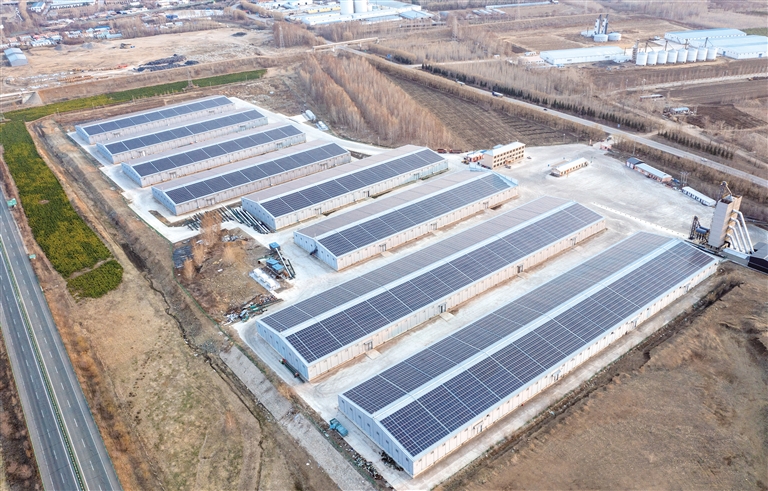 航拍镜头下呼伦贝尔市阿荣旗粮食收储库屋顶光伏发电站一景。阿荣旗作为全国整县屋顶分布式光伏开发试点旗县,目前已实施光伏项目24个,装机容量达7万千瓦。本报记者 王晓博 摄