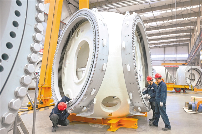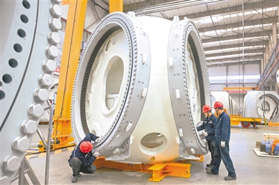 5月14日,运达股份北方总部(乌兰察布)智能产业基地生产车间内工人们有序工作,确保风电机组装配及时完成。该基地是集研发、生产、销售、运维于一体的高新技术产业基地,具备年产500万千瓦风电设备生产能力,主打产品为4兆瓦—10兆瓦及以上风电机组,主要满足内蒙古及周边地区需求,持续赋能我区新能源产业高质量发展。本报记者 王晓博 摄