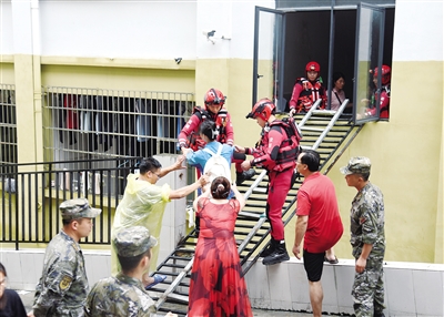 6月23日,救援人员在广西天峨县民族中学转移学生。当日,受持续强降雨影响,广西天峨县民族中学出现内涝,400多名初三学生及30名教师受困校内。据了解,该校为2025年中考考点,为确保考生安全及考试顺利进行,当地将受困学生紧急转移至备用考点天峨县高级中学。