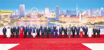 出席峰会的上海合作组织成员国、观察员国、对话伙伴国、主席国客人等20多位外国国家元首、政府首脑及配偶,联合国秘书长等10位国际组织负责人陆续抵达。礼兵列队致敬。伴随着各国名曲音乐,国际贵宾穿过由与会各国国旗、上海合作组织会旗和联合国旗帜组成的恢弘旗阵,沿着红地毯前行。