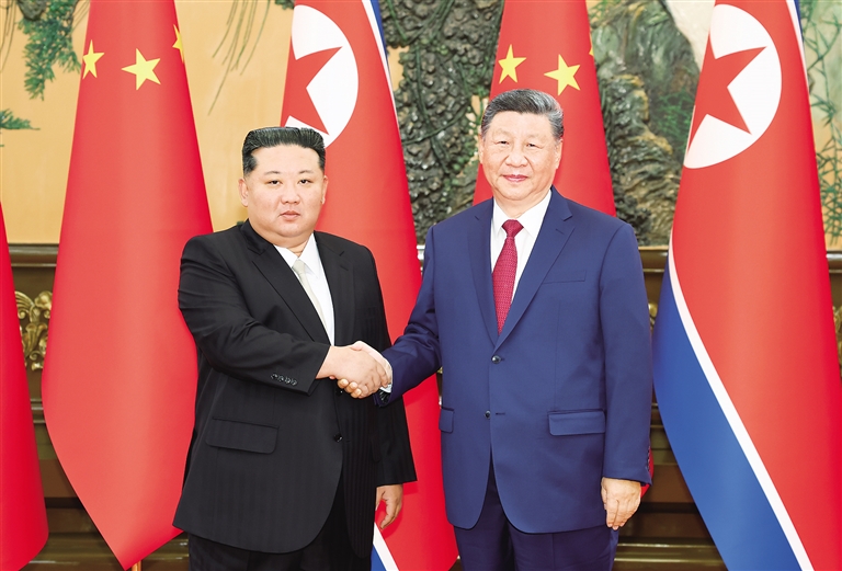 习近平指出,中朝是命运与共、守望相助的好邻居、好朋友、好同志。中朝友谊源远流长,两国都是共产党领导的社会主义国家,有着共同的理想信念和奋斗目标。金正恩总书记来华出席纪念中国人民抗日战争暨世界反法西斯战争胜利80周年活动,体现了朝方维护二战胜利成果的坚定意志,也为中朝两党两国进一步发展友好合作关系提供了重要契机。