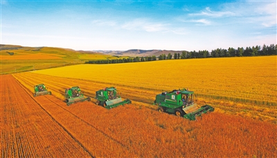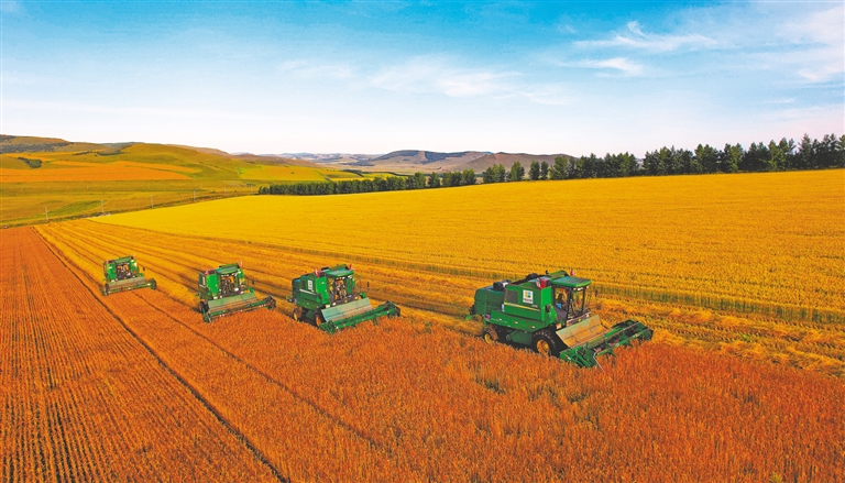 9月7日,在呼伦贝尔农垦三河农牧场公司的小麦田间,几台绿色联合收割机正忙碌作业。今年,该公司依托多元种植布局、科技精准赋能与订单模式引领,54万亩良田进入收获季,绘就丰收的壮美画卷。