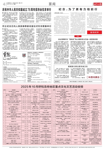 10月4日内蒙古乌兰恰特开心麻花11歌剧《江格尔》10月4日—10月7日内蒙古艺术剧院音乐厅内蒙古艺术剧院12“四海福临”2025德云社德云三筱相声专场呼和浩特站10月7日内蒙古乌兰恰特北京寓思文化传媒有限公司13意大利和格鲁吉亚现代舞作品展演10月10日—10月11日内蒙古艺术剧院音乐厅意大利和格鲁吉亚现代舞团14喜番脱口秀10月12日内蒙古乌兰恰特中毅现场(上海)文化发展有限公司15非遗曲艺书场10月17日—10月18日、10月24日—10月25日乌力格尔艺术宫内蒙古艺术剧院民族曲艺团16脱口秀快乐共暖朋友季10月19日内蒙古乌兰恰特北京前天快乐文化传媒有限公司17观念戏剧舞蹈 《罗密欧AI朱丽叶》10月22日内蒙古乌兰恰特豪思国际182025—2026音乐季 《乐圣贝多芬》——纪念贝多芬诞辰255周年系列音乐会10月24日内蒙古艺术剧院音乐厅呼和浩特爱乐乐团19经典话剧《茶馆》10月24日—10月25日内蒙古乌兰恰特北京老城门剧团20互动式舞台剧《白雪公主和七个小矮人》10月25日内蒙古乌兰恰特陕西中太天恩艺术剧院有限公司21室内音乐会《穿越奥斯卡》10月25日乌力格尔艺术宫内蒙古艺术剧院民族乐团22民族管弦乐家园系列之《家谣》10月25日内蒙古艺术剧院音乐厅内蒙古艺术剧院民族乐团23互动式舞台剧《孙悟空之大闹天宫》10月26日内蒙古乌兰恰特陕西中太天恩艺术剧院有限公司24京剧《汉明妃》10月26日内蒙古艺术剧院音乐厅内蒙古艺术剧院京剧团25话剧《红楼梦》10月29日内蒙古乌兰恰特长春市芝麻艺术剧团26北疆题材交响乐作品交响组曲《山河长歌》10月30日内蒙古艺术剧院音乐厅内蒙古艺术剧院交响乐团27保利城市岛屿音乐季《纯真年代》老狼巡回演唱会10月31日内蒙古乌兰恰特老狼文化28 “歌游内蒙古·唱响北疆”2025内蒙古