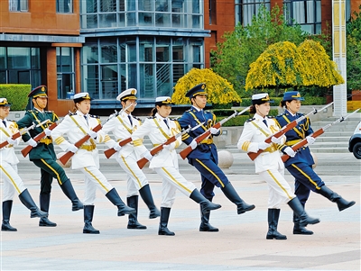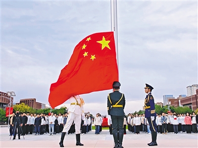 “正步——走!”“向国旗敬礼!”国庆前夕,内蒙古大学国旗护卫队队员高擎国旗,迈着铿锵步伐走向旗杆,以昂扬姿态完成升旗,用行动迎接国庆。