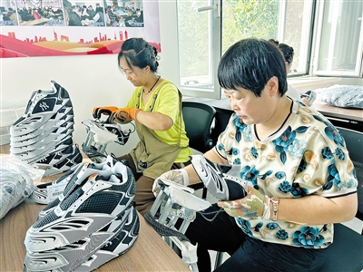 9月30日,在明珠社区就业服务站,记者见到了正在为成品运动鞋穿鞋带的赵亚凡。“穿鞋带每双挣5毛,工资每日现结,全家的日常开销就够了。大家还可以根据自己的实际情况灵活安排工作时间,家里有个急事儿,步行不到5分钟就能赶回去,啥都不耽误。”赵亚凡说。