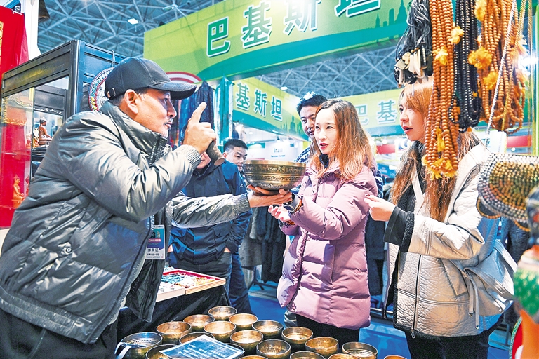 11月12日,顾客在尼泊尔展位挑选商品。当日,为期6天的第十三届中国·内蒙古进出口商品博览会在内蒙古国际会展中心开展。博览会以“创新商务模式、提升国际化水平”为核心,设置展位300余个,来自法国、巴基斯坦、俄罗斯等20余个国家的企业参展,汇聚特色食品、工艺品、化妆品等数千种商品。 本报记者 王磊 摄