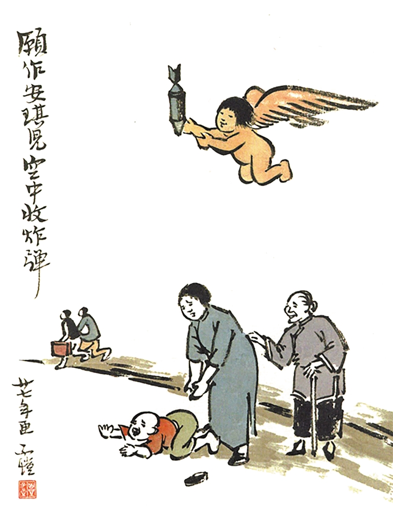 画册中表达抗战胜利,迎接和平的美好愿望的作品所占比例最多,如《我愿化天使,空中收炸弹》《凯归》《解战袍》《胜境在望》《严霜烈日皆经过,次第春风到草庐》《战场之春》《炮弹作花瓶》等。由此可见丰子恺对抗日战争胜利的信心以及对和平的渴望。