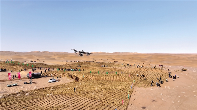 科技创新为生态治理注入新动能,阿拉善盟大力推广无人机飞播造林、节水滴灌等技术,提高造林成活率。今年7月,全长1856公里的三大沙漠锁边林草带实现全面“合龙”,巴丹吉林、腾格里、乌兰布和三大沙漠被牢牢锁住。“封沙育林5年见效、飞播造林7年成林。通过乌兰布和沙漠东缘治理及腾格里沙漠北缘以路治沙、光伏治沙等模式,截至目前,阿拉善全盟累计防沙治沙面积已突破1亿亩。”图布新说。