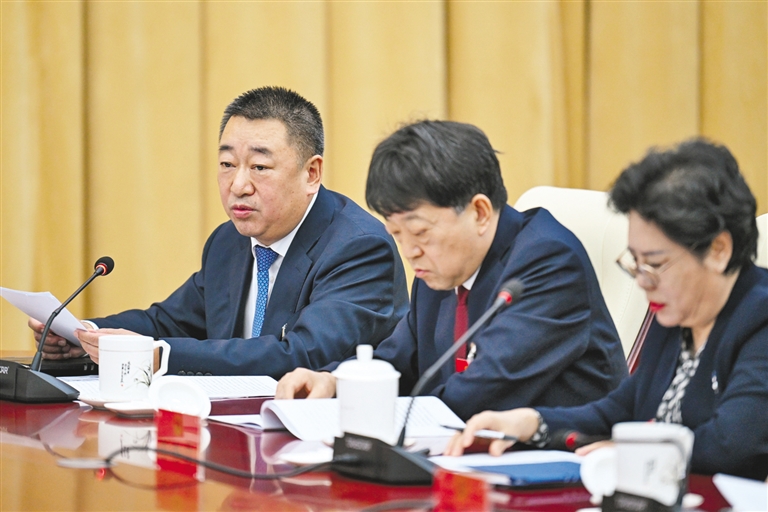 2月4日,赤峰市代表团马立华(左一)代表建议,全面推进绿色矿山建设,将绿色矿山建设要求贯穿于矿业权出让、勘查、开采、闭坑全过程,加大对绿色矿山企业在用地、金融等方面的支持力度。 本报记者 王磊 摄