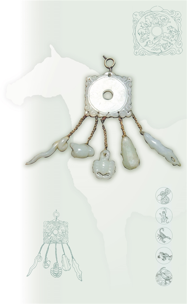 玉璧外缘下端有5个穿孔,每个孔以鎏金银丝各系挂一件动物玉坠。玉坠表面抛光,依次为蛇、猴、蝎子、蟾蜍、蜥蜴5种动物形象。蛇形玉坠长5.5厘米、体径0.6厘米,扁头、尖尾,蛇身上部盘卷,头上翘,嘴部横钻小孔,系3厘米长鎏金银链;猴形玉坠长2.4厘米、宽1.4厘米,左腿曲于胸部,右腿跪于臀下,右手扶膝,左手擒食入嘴,左臂系3.4厘米长鎏金银链;蝎形玉坠长3.2厘米、宽2.5厘米、厚1厘米,3.5厘米长鎏金银链系于尾部;蟾蜍形玉坠腹、背有灰白色斑,整器长3.6厘米、宽1.6厘米、厚1.6厘米,呈爬伏状,昂首,圆眼,嘴部横钻1孔,系2.7厘米长鎏金银链;蜥蜴形玉坠长5.4厘米、宽1厘米、厚0.8厘米,呈爬行状,三腿弯曲于腹下,一条后腿向右伸展与尾部相接,嘴部横钻小孔,系3厘米长鎏金银链。