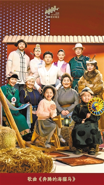 因而,歌声的第二次转调,成为身着牧区日常服装的95人的大合唱:“骏马飞跃风雪苍茫,马背上驮起,悠扬的春光。”伴随着众人豪迈而坚定前行的步伐,长调似乎升华为一首进行曲,踏实的节奏,一步一顿,坚定顽强的精神随着“牧人追赶,天边的彩虹;奔腾的大地,辽阔吉祥。”歌词所呈现的巨大张力,耐人寻味:大地何以奔腾?辽阔何以吉祥?随之,第三次转调出现,这是合唱者集体的文化心境,也是全中国人民共同的心声“阳光洒落,长调的柔情;温暖着每一张幸福的脸庞。”升级版的合唱,是“蒙古马精神”的凸显,也是对前一个节目,即浙江义乌分会场《世界义乌中国年》由成龙与莱昂纳尔·李奇演唱的歌曲《四海一家》的中国式解读。