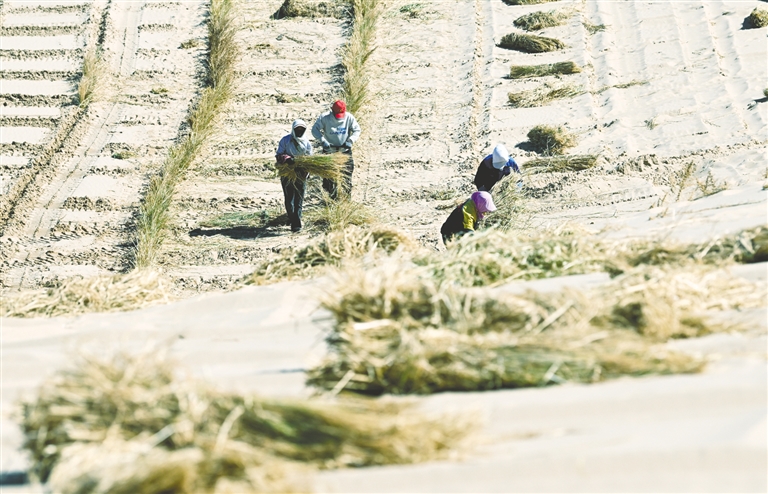 4月4日,在赤峰市翁牛特旗科尔沁沙地治沙项目区,工作人员抢抓黄金施工期,有序推进草方格沙障建设。近年来,翁牛特旗创新推行“以路治沙”模式,在公路两侧构建“乔、灌、草”相结合的防护林体系格局。截至目前,翁牛特旗已建成穿沙公路18条、531公里,完成沿路治沙365.5万亩。本报记者 孟和朝鲁 摄